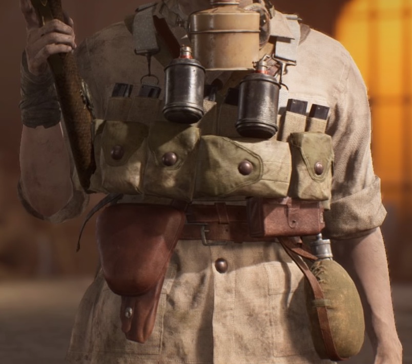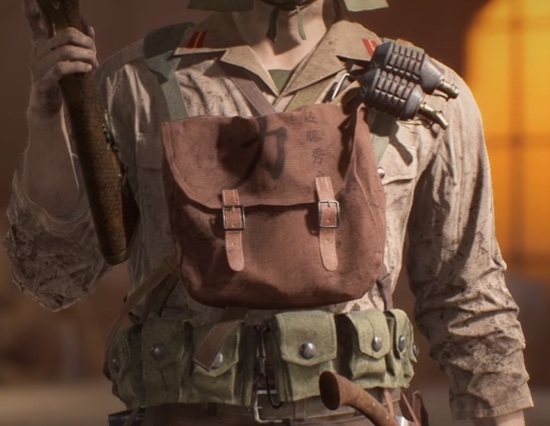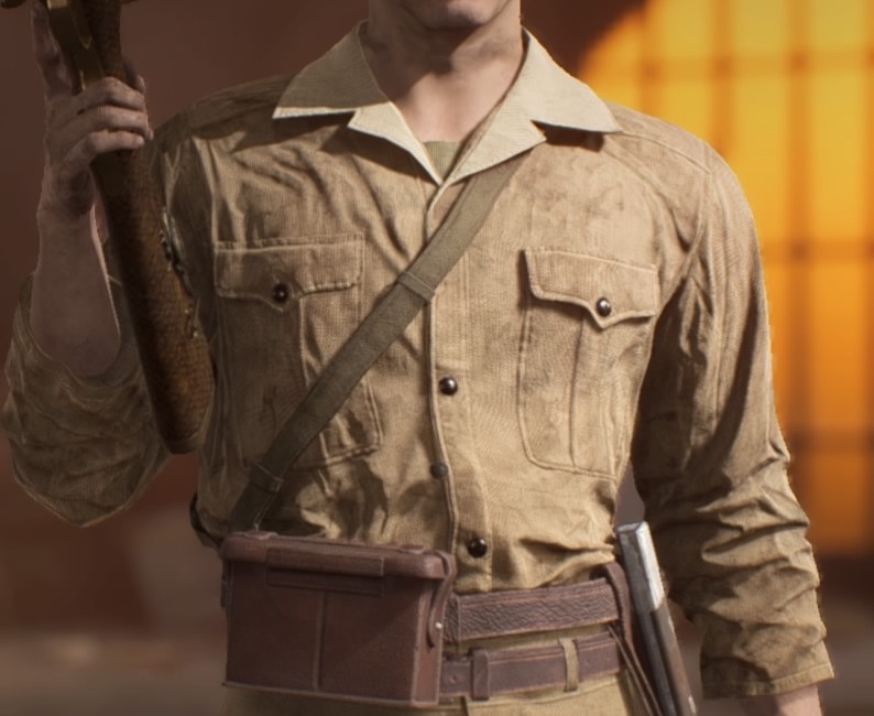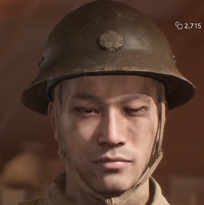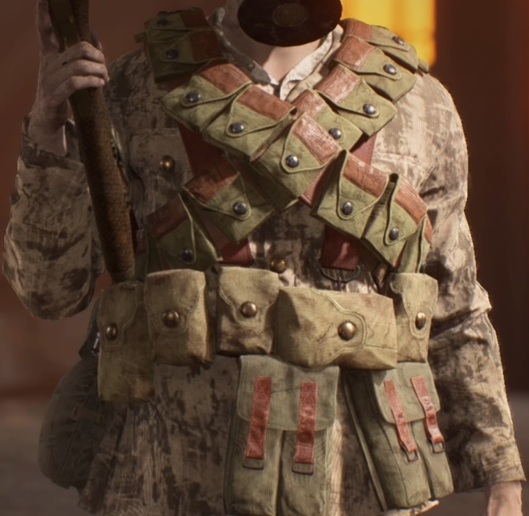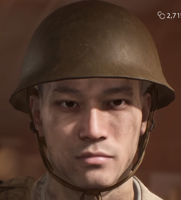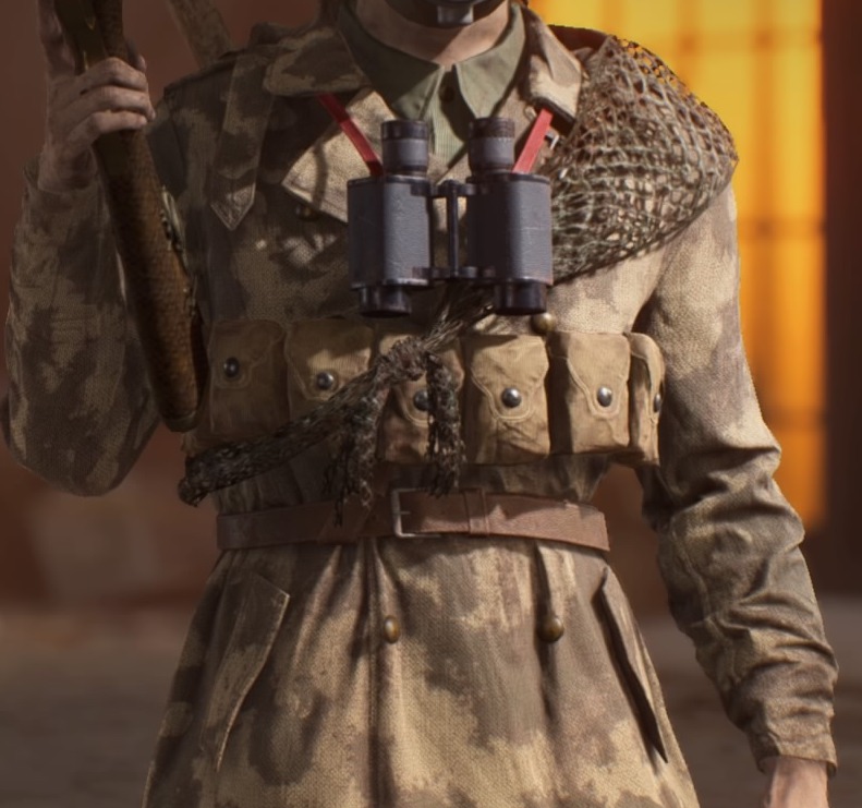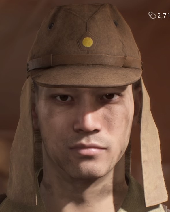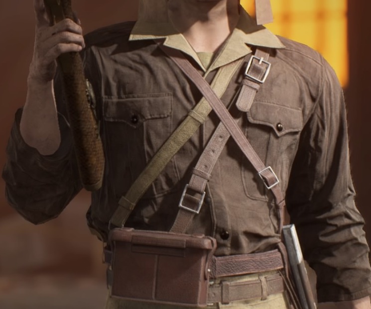 ・甲種 モデルとなったのは海軍陸戦隊 頭部につけているヘルメットは90式鉄帽のカバー付き ただし帽章(錨マーク)がない 上着は海軍の略衣(兵下士官用第三種軍装) ズボンは海軍空挺兵用のものだが靴が陸軍の編み上げ靴 前期型弾薬盒を2つ装備。携行可能弾数は60発分 ・試金石 モデルとなったのは南方の陸軍兵 頭は略帽(ただし五芒星が丸に変更されている)上着は陸軍防暑襦袢 ズボンは昭5式軍袴 脚絆を巻いているものの結集や追い風のものとは異なり営内巻きという少し異なるものになっている ズボンに付いている銃剣は両刃という点をのぞくと三十年式銃剣に酷似している 前盒を一つ装備 ・歩兵 モデルは海軍陸戦隊 上着は海軍陸戦隊の兵下士官用服 ・国境警備 モデルは防空警防団? ヘルメットは防空警防団の物 上着は第二種作業衣 ただし本来はつなぎ型 ズボンは防寒作業衣 しかしこれも本来はつなぎ型 階級章は特務曹長 図のう付き ・熱射 モデルは太平洋戦争終盤の陸軍兵 頭は試金石の色違いにゴーグル着用 上着は兵下士官用防暑略衣 ズボンは98式軍用夏袴 革袢脚を着用 水筒を装備 ・驟雨 モデルは中国戦線の陸軍兵? 頭は試金石の色違い(赤茶色) 上着は改45式外套 ズボンは不明 弾薬盒は恐らく後期型弾薬盒の後盒 前盒2つに後盒1つ、前後それぞれ60発で計120発を携行 後盒は蓋がベルト留め、側面に錆防止用の油缶入れが付く ・砕け波 モデルは不明 南方の日本軍兵士? 水筒を装備 下は脚絆に足袋 ・探索者 モデルは不明 歩兵の色違い 南部ホルスターとゴーグルが付いている 下は砕け波と同じく脚絆に足袋 ・追い風 モデルは南方の日本軍兵士? 帽子は略帽ではなく椀帽(わんぼう) 上陸兵と同じように弾薬をたすき掛けしている ・上陸兵 モデルは海軍空挺部隊 頭は降下用のヘルメット? 上着は海軍兵略衣 たすき掛けしている弾薬ポーチは架空の物? ・結集 モデルは南方の陸軍兵 頭は略帽に帽垂布 上着は陸軍防暑襦袢こちらの方が暗色 背面腰に図嚢がある 水筒はなぜか海軍のカバー付きのもの ・雨風 モデルは不明 頭は熱射のものに帽垂布を付けゴーグルを帽子の上に付けたもの 服は驟雨の色を明るくしたもの ・戦士 モデルは海軍空挺部隊と義烈空挺部隊 頭部は民間の十七年式防空用防毒面と国境警備のヘルメット たすき掛けの一式弾帯(これのように皮で補強してあるのが一式、省略型が二式)と腰に空挺用複合弾帯、短機関銃用の弾倉入れを装備 前部の細長いポーチは実際はおそらく機関銃の工具入れ ちなみにメナド降下作戦の空挺部隊がこのスキンのように弾薬をたすき掛けしているため元ネタはここからか ・鉄の雨 モデルは高砂義勇隊(台湾の先住民族である高砂族で構成された部隊、所謂グルカ兵のような物、スキンにも付いている独特な形の蕃刀も台湾の民族の物である) 頭はおそらく上陸兵のものの下に結集の帽子を装備したものか 上下着は陸軍防暑襦袢を着用 階級は兵長? 腰には二式弾帯を装備する。図のう、飯盒付き ・鬼 モデルは海軍陸戦隊? 頭にガスマスクと制帽を装備 ガスマスクは海軍の93式防毒面か97式防毒面のどちらかと思われる 制帽は45式制帽と思われるが詳細不明 外套は驟雨・雨風の色違いに双眼鏡 弾薬ポーチなどがついたもの 背中にスコップを背負っている。 ・マムシ モデルは不明 頭は上陸兵の物に草を付けたもの 服は熱射のものの色違いに南部ホルスター・前盒2つを装備 ・護国 モデルは戦車兵? 頭は戦車兵用のヘルメットにゴーグル(戦車兵用のもの?) 服は国境警備の物にボディーアーマー(形式不明)に九六/九九式用弾倉入れにサスペンダー式の擲弾筒入れが付きを付けている 階級は准尉 ・達人 モデルは義烈空挺隊 ただしズボンの迷彩が濃淡色ではなくカーキ色に黒という別の物になっている 九九式手りゅう弾2つと複合弾帯(ただしホルスターがついておらず別に革製のものを着用。)短機関銃用弾倉入れをサスペンダーで吊るしている? ・雷 モデルは不明 南方の日本軍兵士? 頭には虎の描かれた鉢巻?を付けている 服はタンクトップにたすき掛けの弾薬・97式手榴弾・うちわなどを装備 下は砕け波・追い風と同じく脚絆に足袋だがやや迷彩がかかっている?