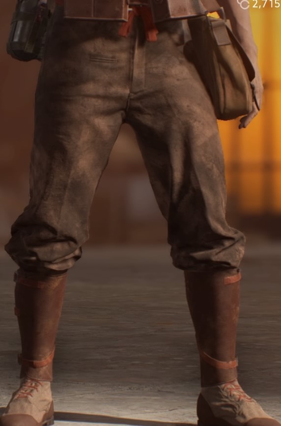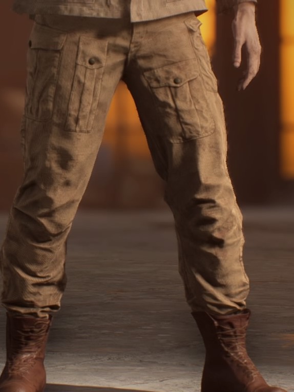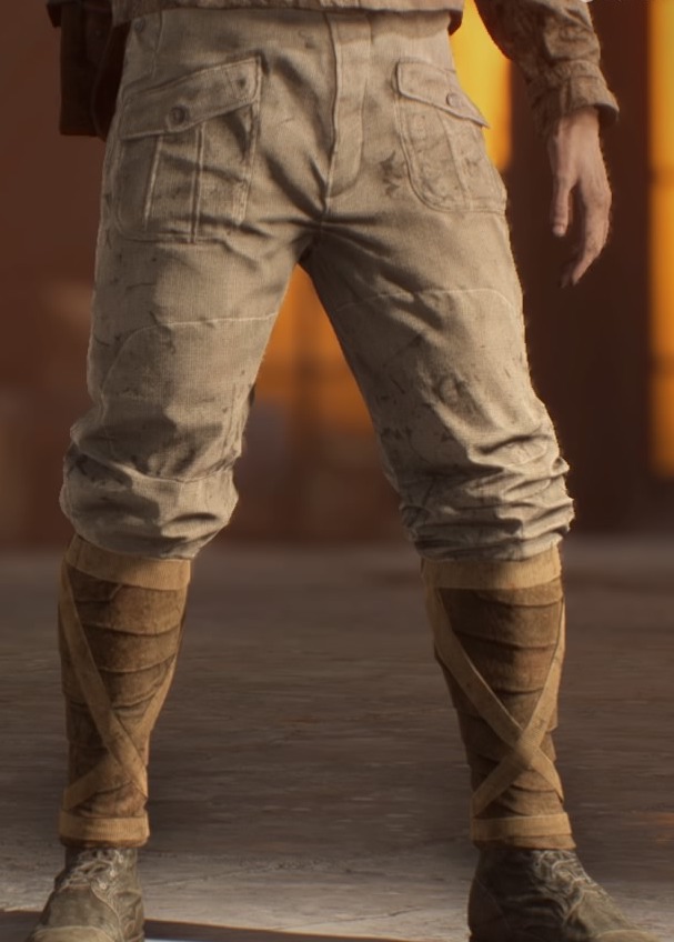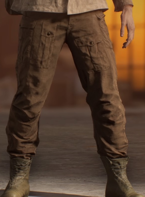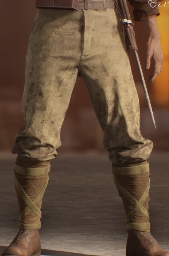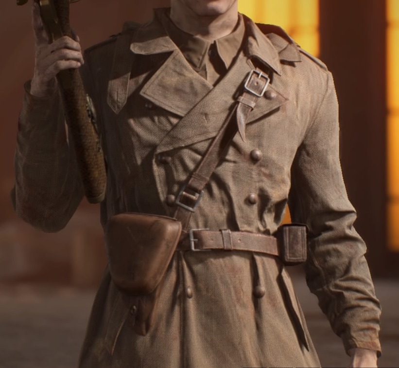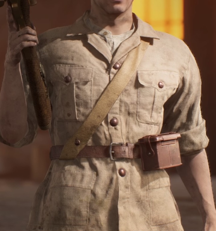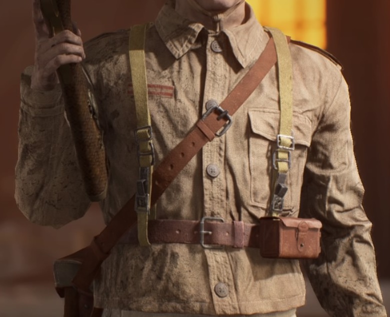 ・甲種 モデルとなったのは海軍陸戦隊 頭部につけているヘルメットは90式鉄帽のカバー付き ただし帽章(錨マーク)がない 上着は海軍の略衣(兵下士官用第三種軍装) ズボンは海軍空挺兵用のものだが靴が陸軍の編み上げ靴 前期型弾薬盒を2つ装備。携行可能弾数は60発分 ・試金石 モデルとなったのは南方の陸軍兵 頭は略帽(ただし五芒星が丸に変更されている)上着は陸軍防暑襦袢 ズボンは昭5式軍袴 脚絆を巻いているものの結集や追い風のものとは異なり営内巻きという少し異なるものになっている ズボンに付いている銃剣は両刃という点をのぞくと三十年式銃剣に酷似している 前盒を一つ装備 ・歩兵 モデルは海軍陸戦隊 上着は海軍陸戦隊の兵下士官用服 ・国境警備 モデルは防空警防団? ヘルメットは防空警防団の物 上着は第二種作業衣 ただし本来はつなぎ型 ズボンは防寒作業衣 しかしこれも本来はつなぎ型 階級章は特務曹長 図のう付き ・熱射 モデルは太平洋戦争終盤の陸軍兵 頭は試金石の色違いにゴーグル着用 上着は兵下士官用防暑略衣 ズボンは98式軍用夏袴 革袢脚を着用 水筒を装備 ・驟雨 モデルは中国戦線の陸軍兵? 頭は試金石の色違い(赤茶色) 上着は改45式外套 ズボンは不明 弾薬盒は恐らく後期型弾薬盒の後盒 前盒2つに後盒1つ、前後それぞれ60発で計120発を携行 後盒は蓋がベルト留め、側面に錆防止用の油缶入れが付く ・砕け波 モデルは不明 南方の日本軍兵士? 水筒を装備 下は脚絆に足袋 ・探索者 モデルは不明 歩兵の色違い 南部ホルスターとゴーグルが付いている 下は砕け波と同じく脚絆に足袋 ・追い風 モデルは南方の日本軍兵士? 帽子は略帽ではなく椀帽(わんぼう) 上陸兵と同じように弾薬をたすき掛けしている ・上陸兵 モデルは海軍空挺部隊 頭は降下用のヘルメット? 上着は海軍兵略衣 たすき掛けしている弾薬ポーチは架空の物? ・結集 モデルは南方の陸軍兵 頭は略帽に帽垂布 上着は陸軍防暑襦袢こちらの方が暗色 背面腰に図嚢がある 水筒はなぜか海軍のカバー付きのもの ・雨風 モデルは不明 頭は熱射のものに帽垂布を付けゴーグルを帽子の上に付けたもの 服は驟雨の色を明るくしたもの ・戦士 モデルは海軍空挺部隊と義烈空挺部隊 頭部は民間の十七年式防空用防毒面と国境警備のヘルメット たすき掛けの一式弾帯(これのように皮で補強してあるのが一式、省略型が二式)と腰に空挺用複合弾帯、短機関銃用の弾倉入れを装備 前部の細長いポーチは実際はおそらく機関銃の工具入れ ちなみにメナド降下作戦の空挺部隊がこのスキンのように弾薬をたすき掛けしているため元ネタはここからか ・鉄の雨 モデルは高砂義勇隊(台湾の先住民族である高砂族で構成された部隊、所謂グルカ兵のような物、スキンにも付いている独特な形の蕃刀も台湾の民族の物である) 頭はおそらく上陸兵のものの下に結集の帽子を装備したものか 上下着は陸軍防暑襦袢を着用 階級は兵長? 腰には二式弾帯を装備する。図のう、飯盒付き ・鬼 モデルは海軍陸戦隊? 頭にガスマスクと制帽を装備 ガスマスクは海軍の93式防毒面か97式防毒面のどちらかと思われる 制帽は45式制帽と思われるが詳細不明 外套は驟雨・雨風の色違いに双眼鏡 弾薬ポーチなどがついたもの 背中にスコップを背負っている。 ・マムシ モデルは不明 頭は上陸兵の物に草を付けたもの 服は熱射のものの色違いに南部ホルスター・前盒2つを装備 ・護国 モデルは戦車兵? 頭は戦車兵用のヘルメットにゴーグル(戦車兵用のもの?) 服は国境警備の物にボディーアーマー(形式不明)に九六/九九式用弾倉入れにサスペンダー式の擲弾筒入れが付きを付けている 階級は准尉 ・達人 モデルは義烈空挺隊 ただしズボンの迷彩が濃淡色ではなくカーキ色に黒という別の物になっている 九九式手りゅう弾2つと複合弾帯(ただしホルスターがついておらず別に革製のものを着用。)短機関銃用弾倉入れをサスペンダーで吊るしている? ・雷 モデルは不明 南方の日本軍兵士? 頭には虎の描かれた鉢巻?を付けている 服はタンクトップにたすき掛けの弾薬・97式手榴弾・うちわなどを装備 下は砕け波・追い風と同じく脚絆に足袋だがやや迷彩がかかっている?