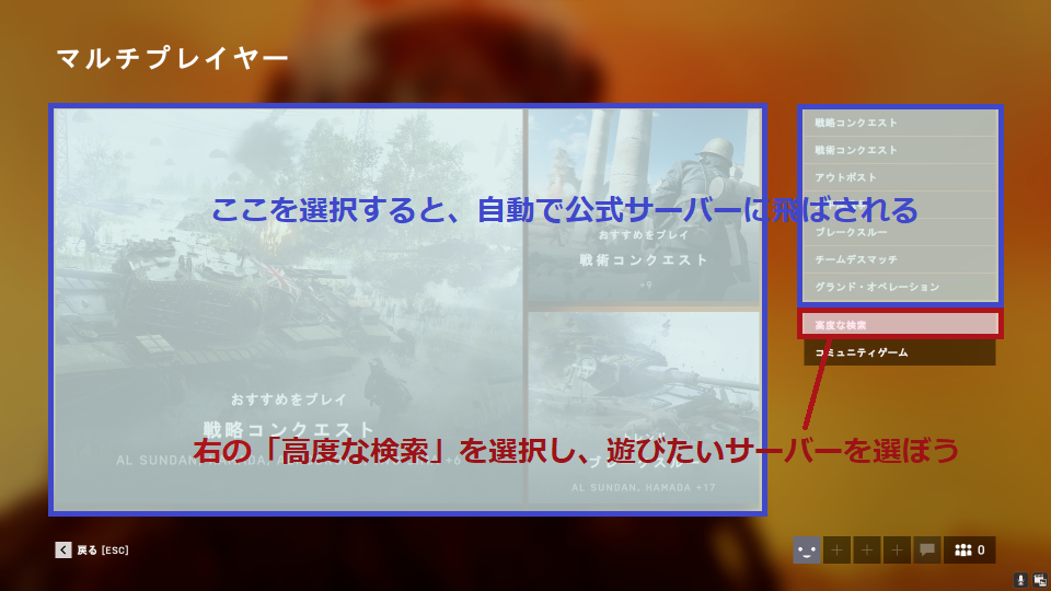ホーム画面で「出撃」から「マルチプレイ」を選択すると、上のような画面になる。ここでは必ず「高度な検索」を選択しよう。「クイックプレイ」などを選択すると公式鯖に飛ばされてしまうので注意すること。